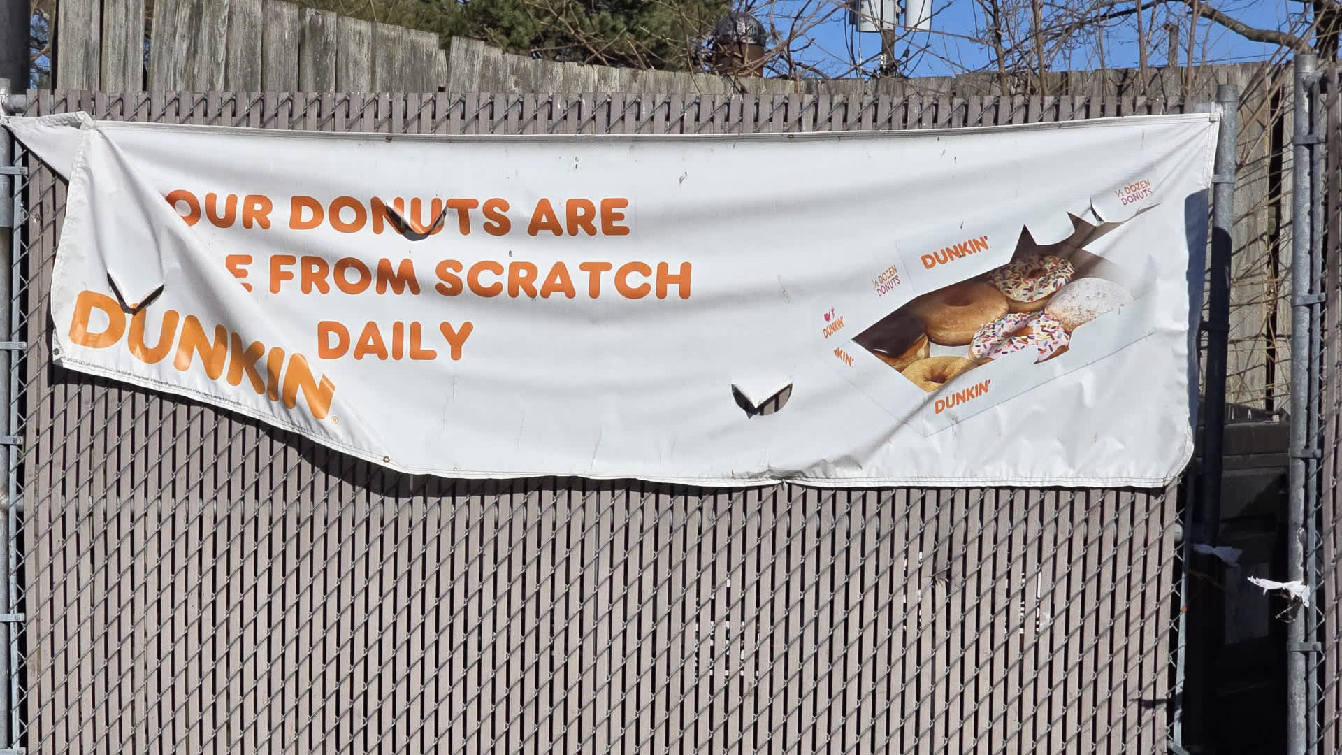 In a Reddit post shared to r/DunkinDonuts, a banner reading "Our donuts are made from scratch daily" hangs above a heap of uneaten baked goods strewn on the ground behind a fence.