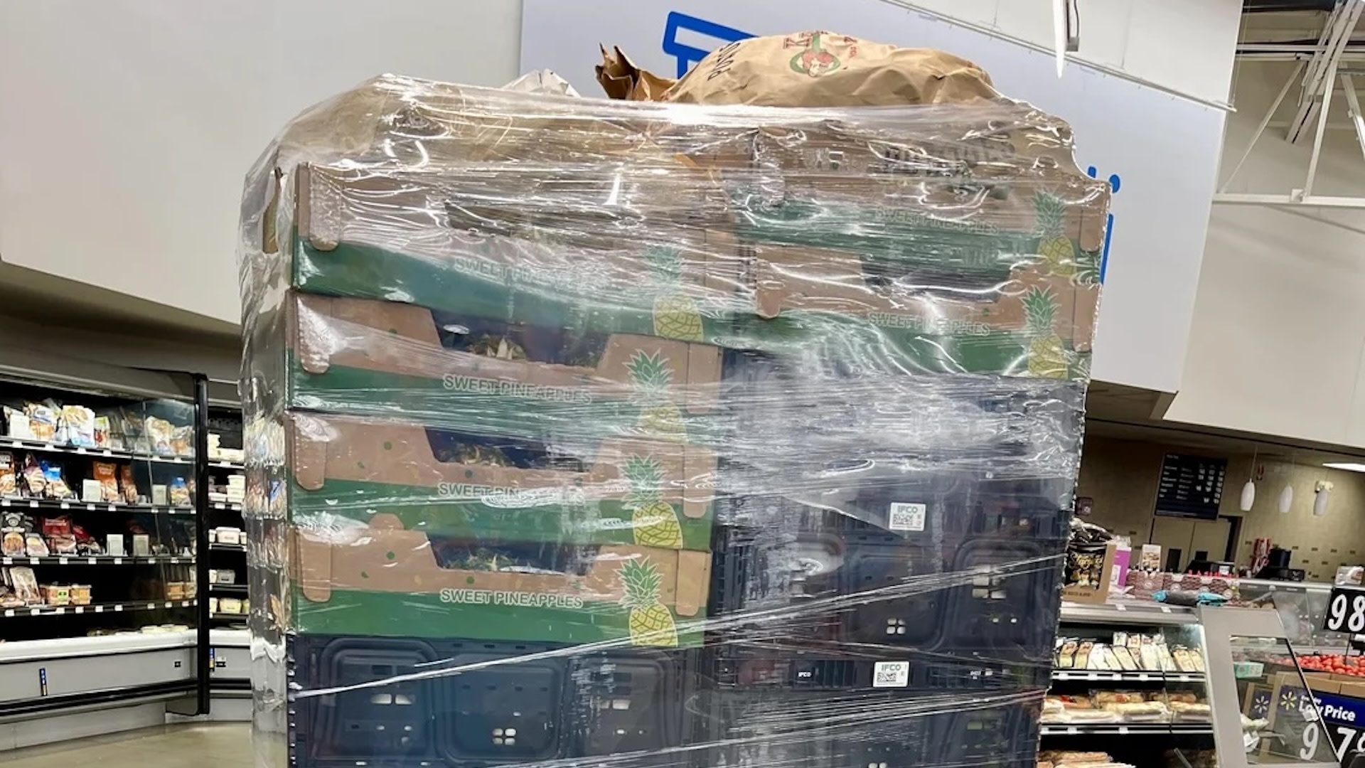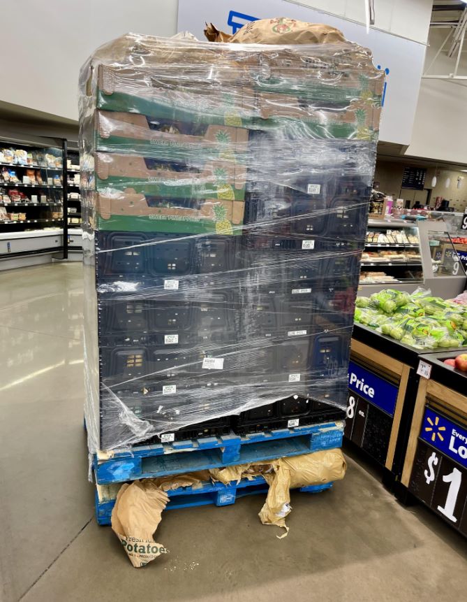In the subreddit r/Walmart, the employee shared a photo of a 1,600-plus-pound pallet stacked high with produce. The potatoes were at the bottom, appearing to bear much of the weight.