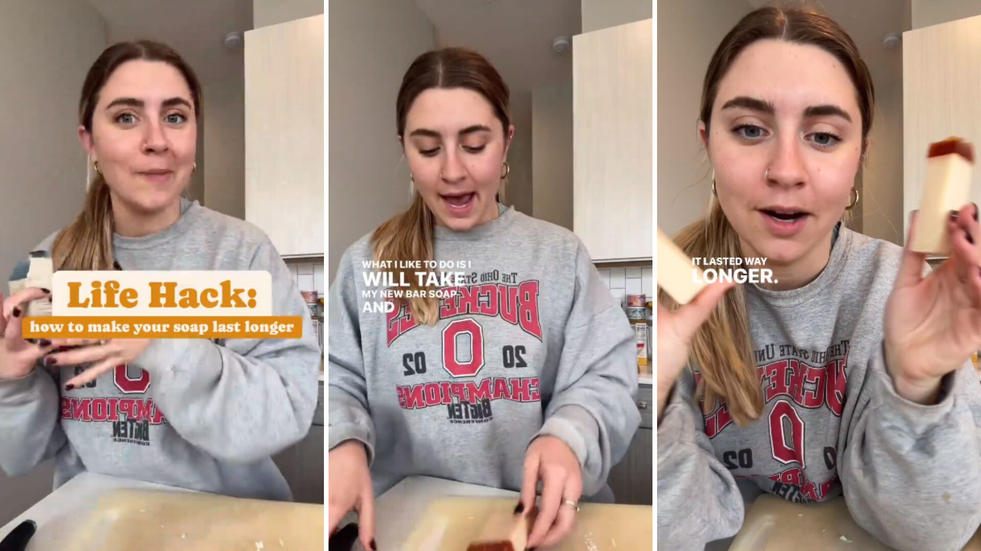 "The experiment that I ran is in two bars of soap. One I cut up, one I used just regular in the shower and kept it there, used it; I felt like it went away … super fast. Then I used the ones that were chunked into sections and it lasted way longer," she explains in the Reel.