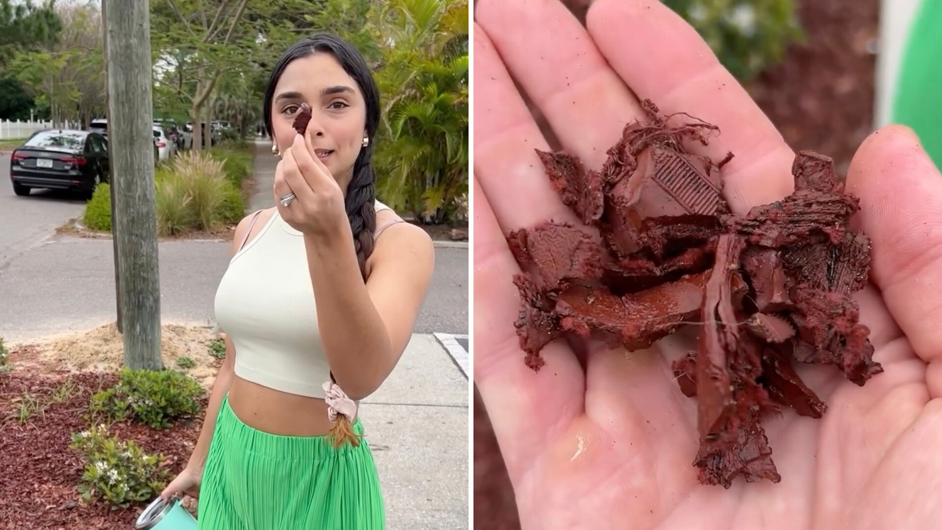The video shows a garden bed filled with what appears to be spray-painted brown rubber chips. "What's the point of putting rubber on the soil?" one person in the video asks. "So you don't have to buy any more? The point of mulch is for it to decompose so it can feed the soil, so this doesn't make any sense."