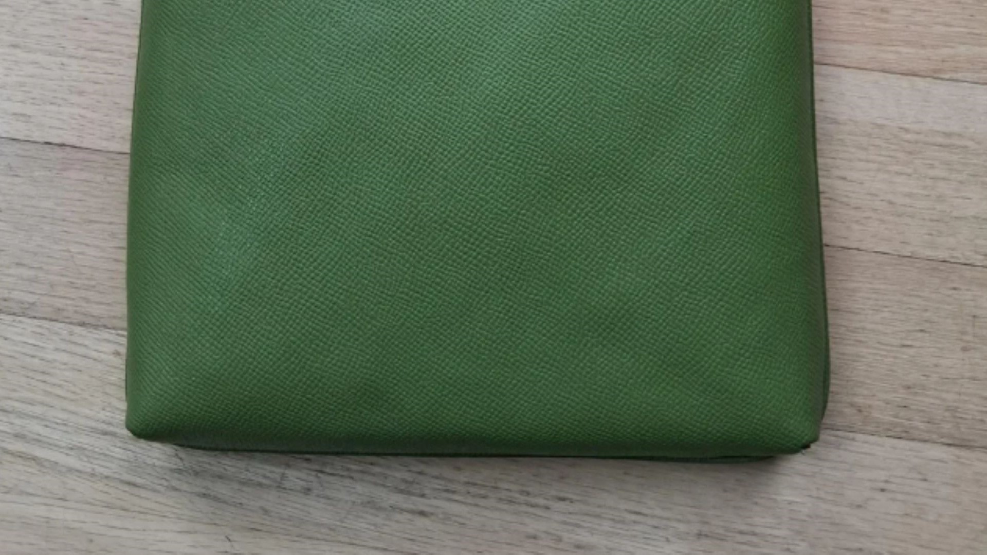The OP's photos show a forest green crossbody bag with an outer pocket, zipper closure, and unscratched and intact hardware. Paper stuffing is inside, and the purse appears to be brand new.