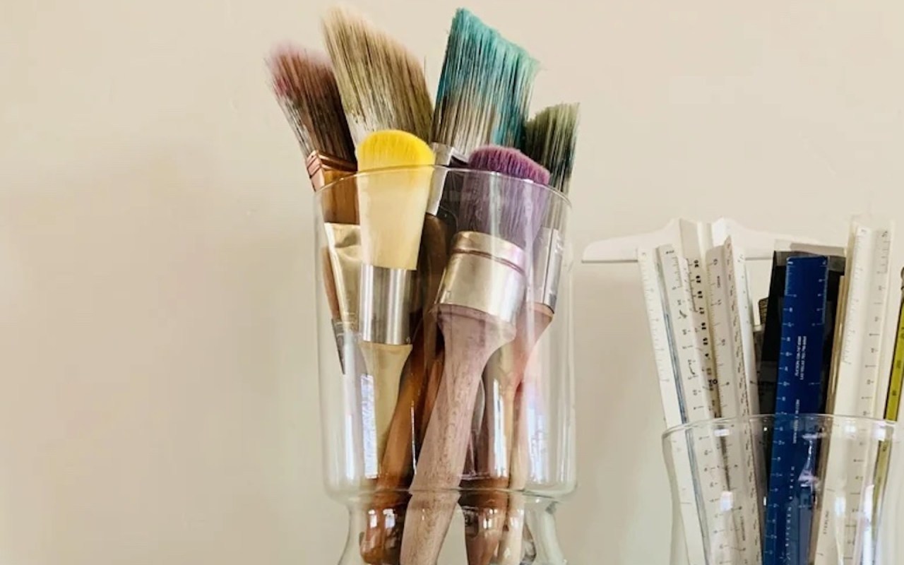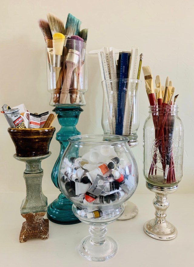 The user shared a photo of their jars of paint brushes, paints, and other art supplies glued to decorative pedestals, making them easier to reach and improving the aesthetic of this necessary organization.
