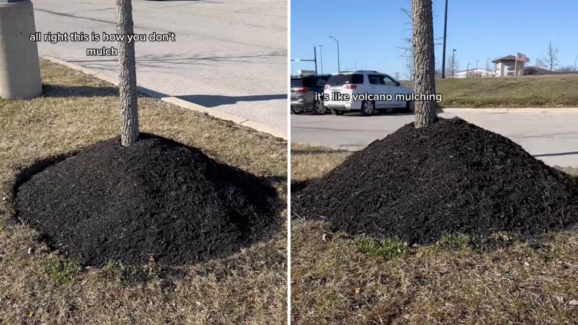 Volcano mulching, which is the act of needlessly piling up mulch around the base of a tree, can cause a laundry list of problems. In Wasson's video, he discovers a tree in a public area with a mulch volcano.