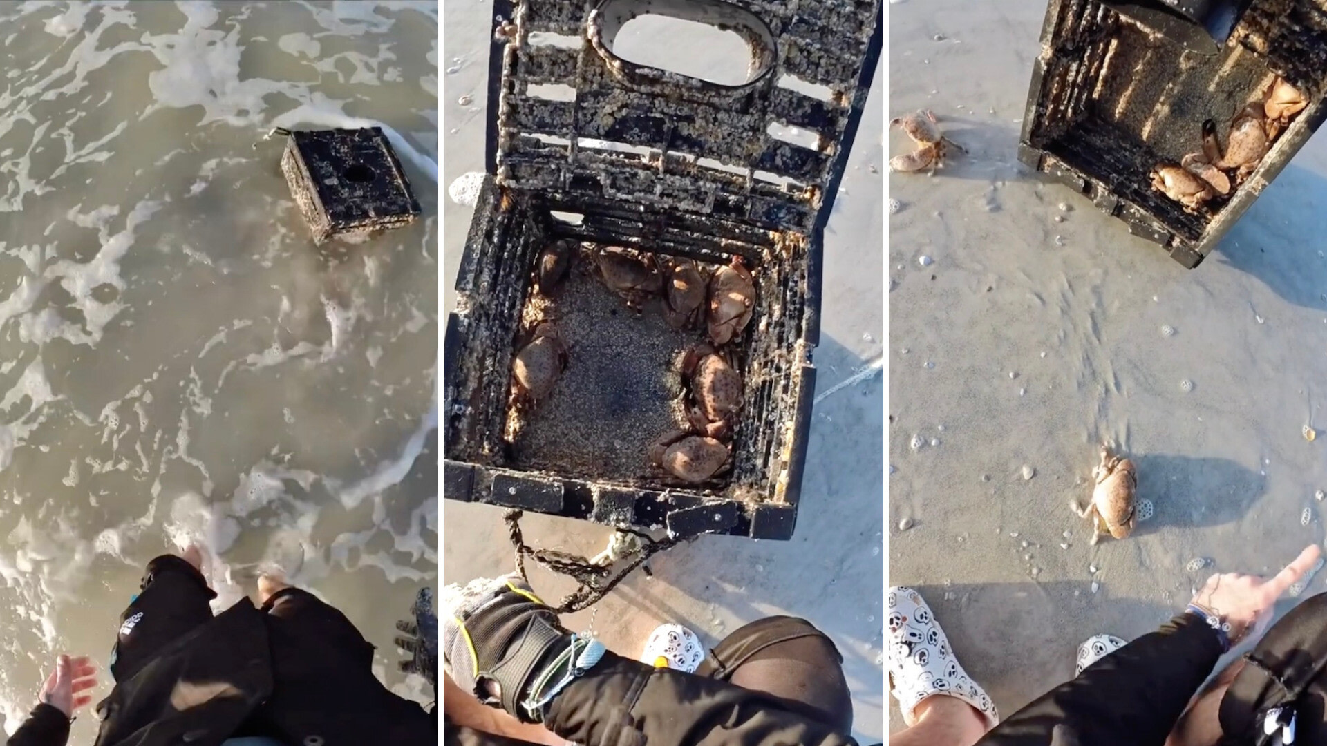 He found an abandoned crab trap that had washed ashore and discovered several crabs inside.